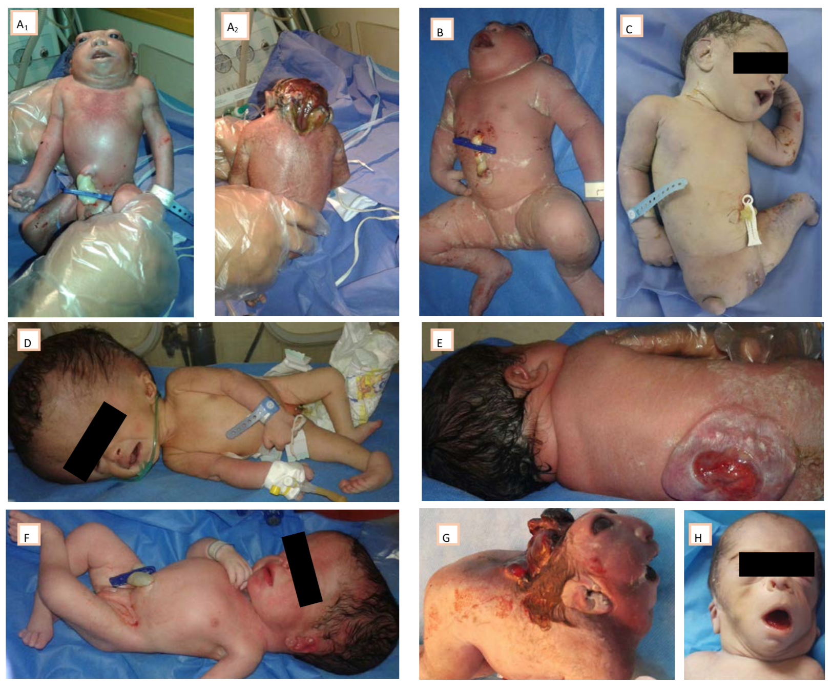 birth defects include: anencephaly (A1 and A2 , B), lower limb anomalies